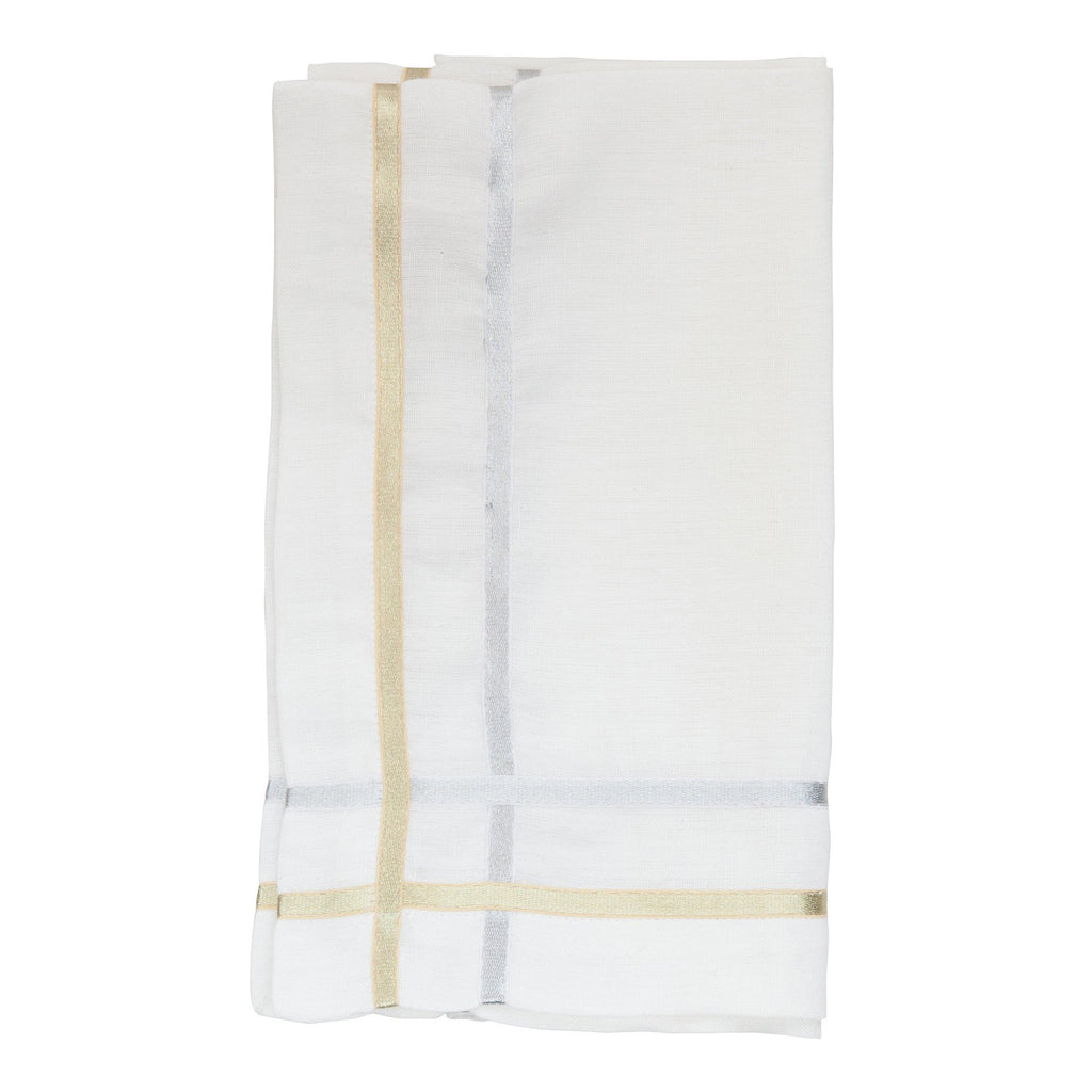 Metallic gold and silver trim shimmers against a pristine white linen backdrop to add a dash of glamour and shine to dinner parties.